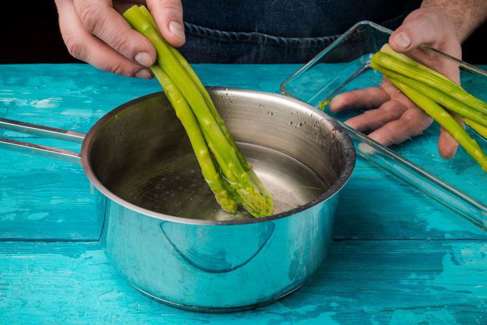 Спаржу отвариваем до готовности. Сливаем воду.
