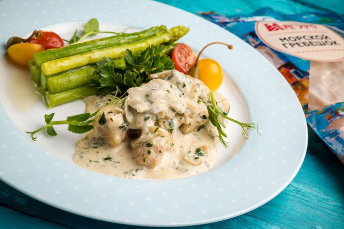 Сервируем блюдо. На тарелку выкладываем спаржу, а рядом — сливочный соус с морскими гребешками. Подаем к столу!