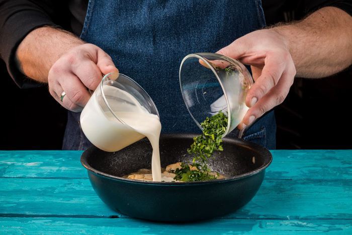 Добавляем сливки и рубленую петрушку. Сверху посыпаем натертым сыром. Готовим 5 минут и снимаем с огня.