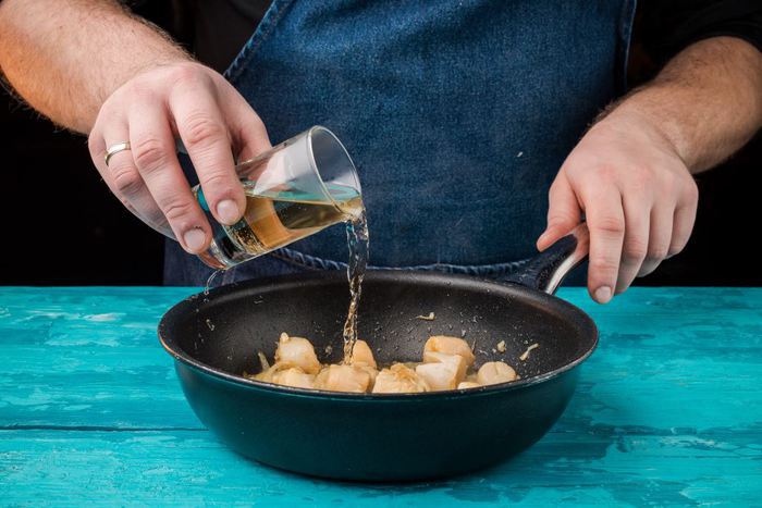 Вливаем в сковороду белое вино, тушим, пока оно полностью не выпарится.