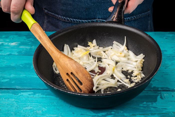 Измельчаем лук и чеснок, поджариваем слегка на оливковом масле.