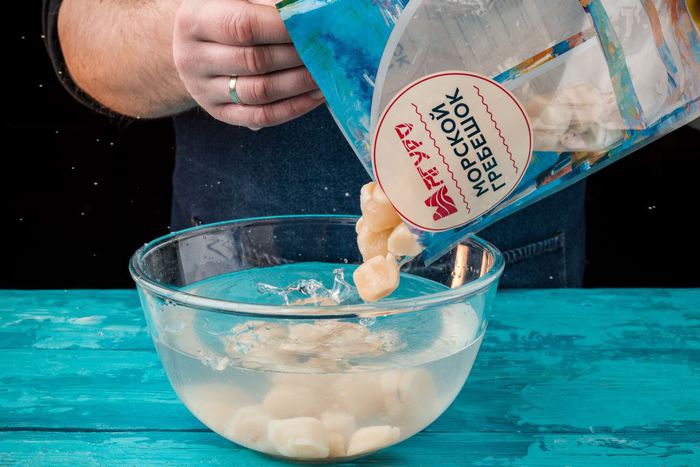 Морские гребешки ТМ «Магуро» размораживаем, моем.