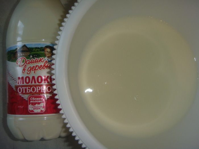 Отборное молоко «Домик в деревне» подогреть и растворить в нем сахар с солью.