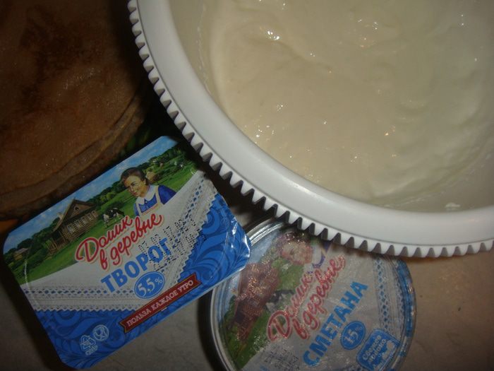 Для соуса взбить миксером мягкий творог «Домик в деревне» со сметаной «Домик в деревне» и сахарной пудрой.