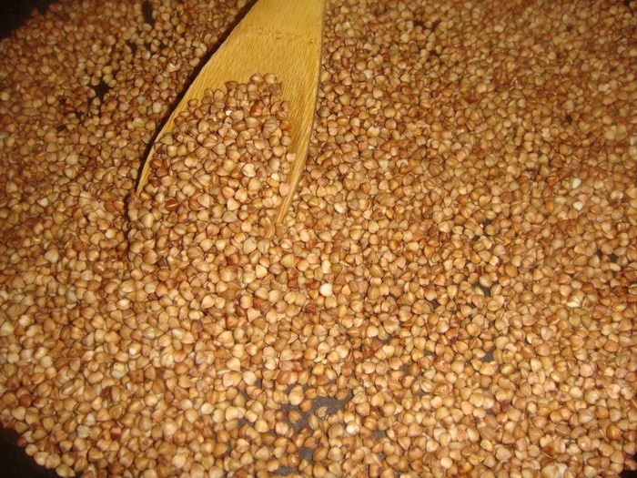 Гречневую муку я сделала сама. 1,5 стакана гречки хорошо промыть и обжарить на сухой сковороде.