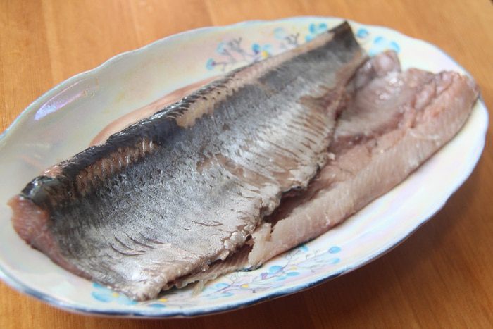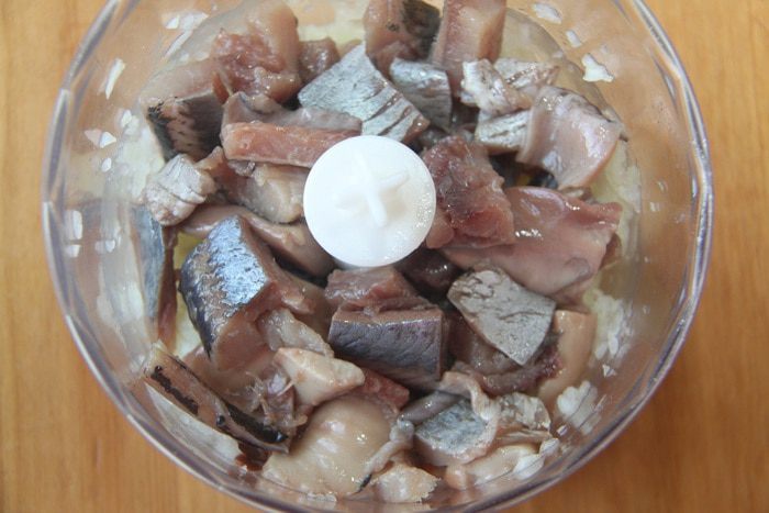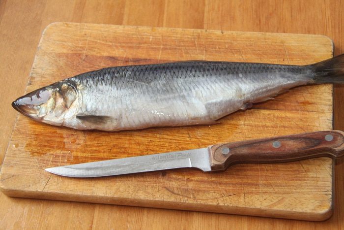 Сельдь весом 300 г разделать: снять кожу вместе с чешуей, удалить голову, хвост, плавники, хребет и крупные кости.
