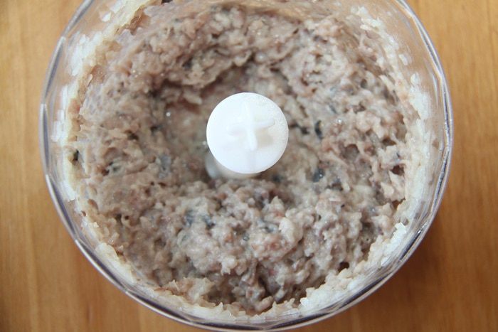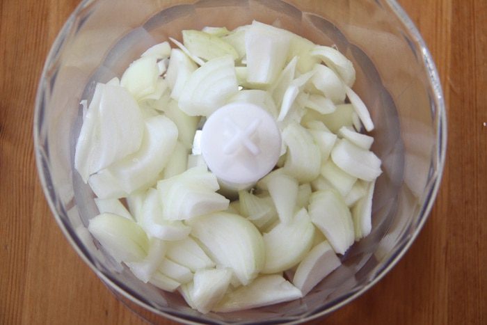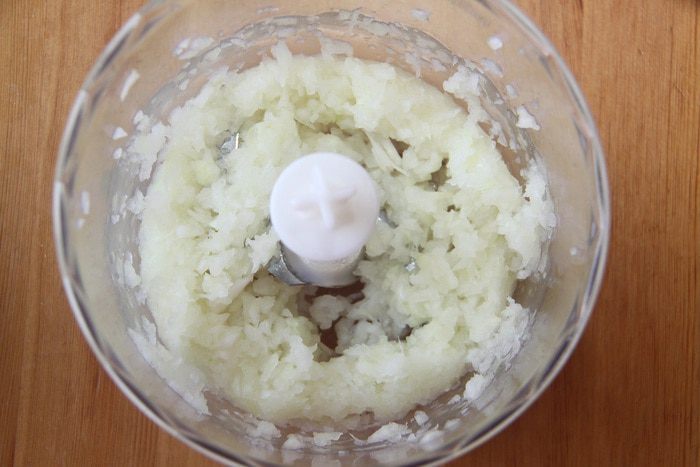 Измельчить лук до состояния кашицы. Раньше все перекручивали через мясорубку, а теперь все можно приготовить в блендере.