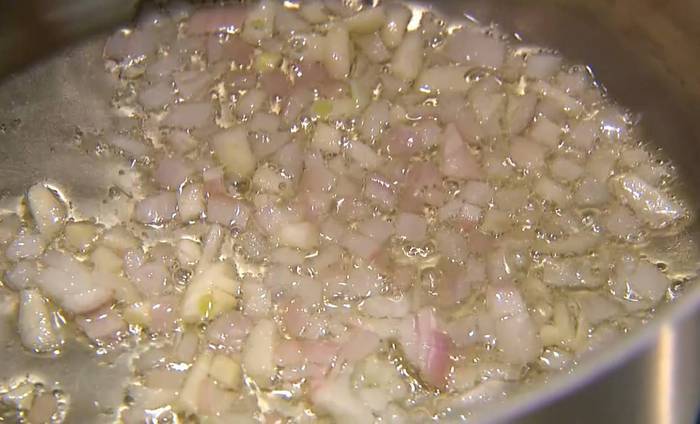 В большой кастрюле разогреть оливковое масло и обжарить лук до мягкости.
