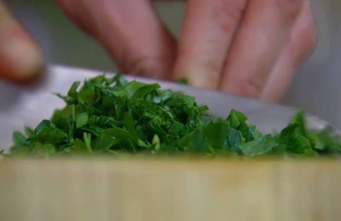 Перец чили, чеснок и листья петрушки измельчить и добавить в кастрюлю к овощам, посыпать тимьяном, все перемешать и прогревать еще 2–3 минуты.