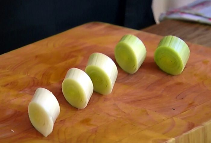 Светлую часть лука-порея, сельдерей и фенхель крупно порезать.