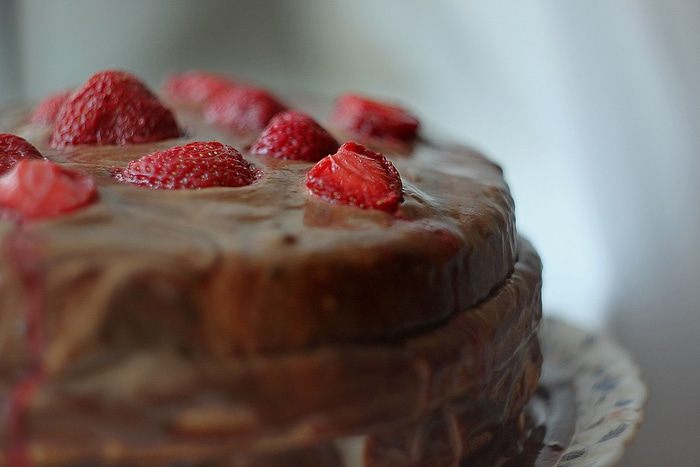 Далее собираем торт: берем корж, смазываем кремом, выкладываем сверху порезанную клубнику (можно свежую, можно замороженную), сверху накрываем следующим коржом и повторяем действие. Верхний корж можно сразу полить глазурью и украсить клубникой. А можно сделать "мраморную" глазурь - покрыть бисквит сначала кремом, а затем полить глазурью и ложкой немного перемешать, чтобы появились разводы. Сверху снова же украсить клубникой.