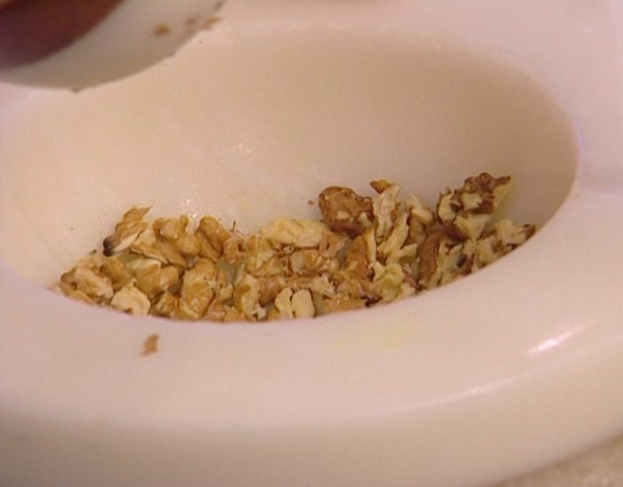 Грецкие орехи разломить на кусочки или растолочь в ступке и добавить к салату.