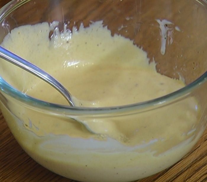 Приготовить заправку: взбить венчиком растительное масло, добавить сливки, горчицу, сок лимона, поперчить и взбить все еще раз.
