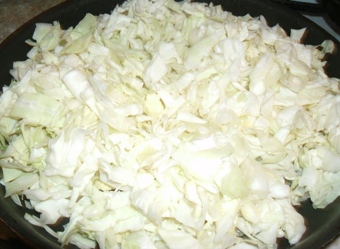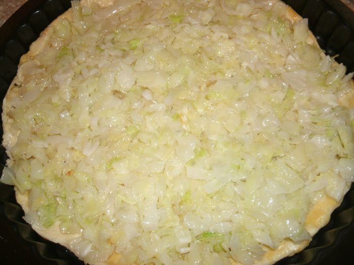На тесто первым слоем выложить обжаренную и слегка остывшую капусту.