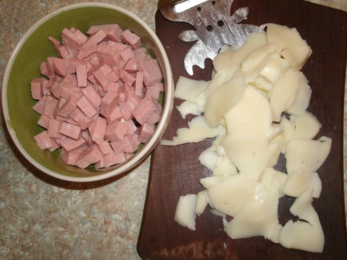 Вареную колбасу нарезать мелкими кубиками, сыр — пластинками (лучше сделать это сырорезкой).