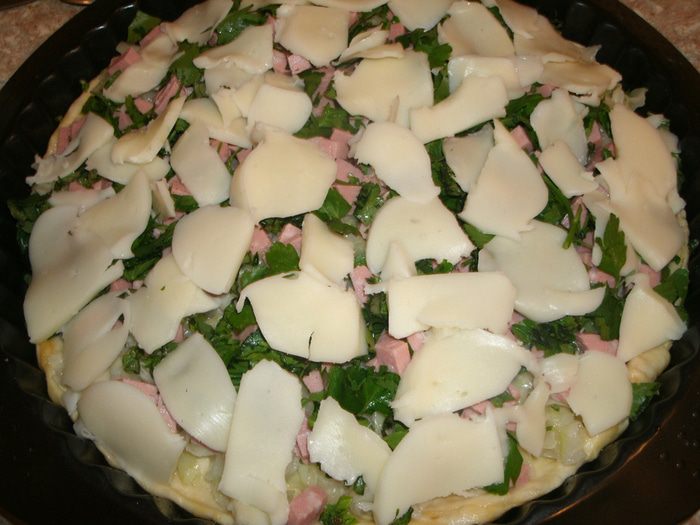 Уложить пластинки сыра сверху, распределив их по всей поверхности.