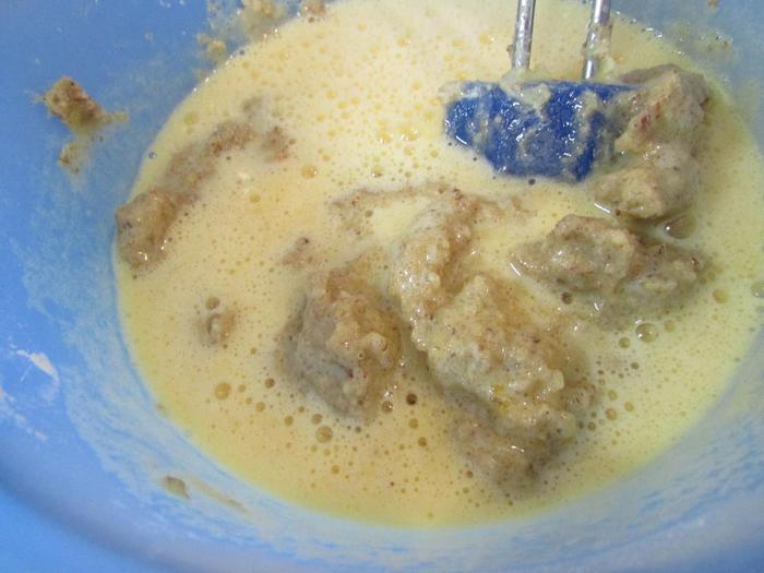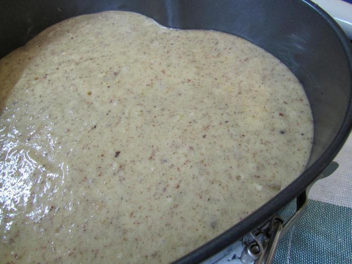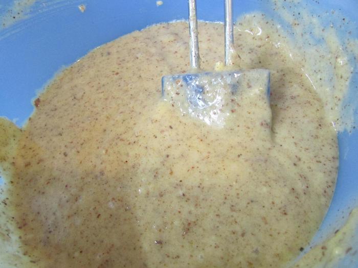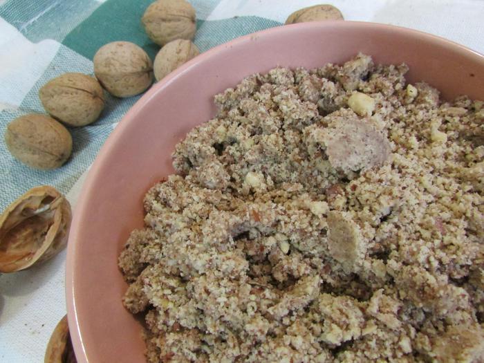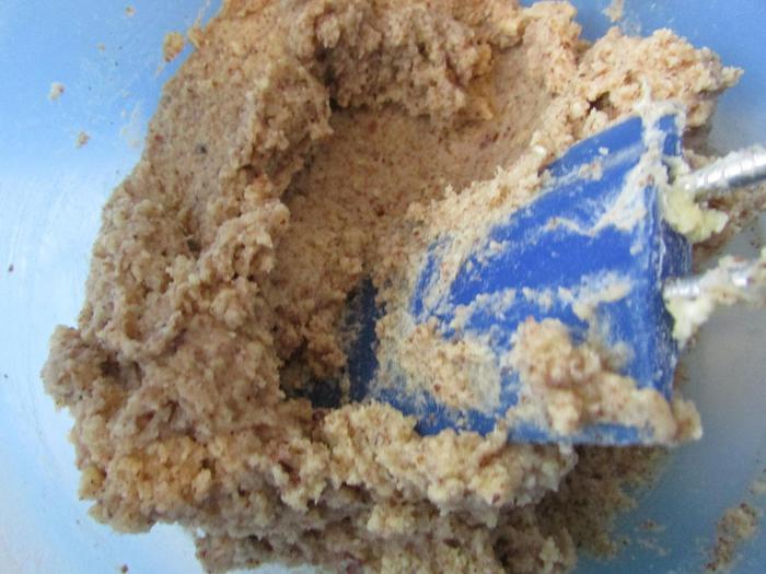 Приготовить тесто № 2. В кофемолке измельчить орехи (у автора фундук, у меня — грецкие).