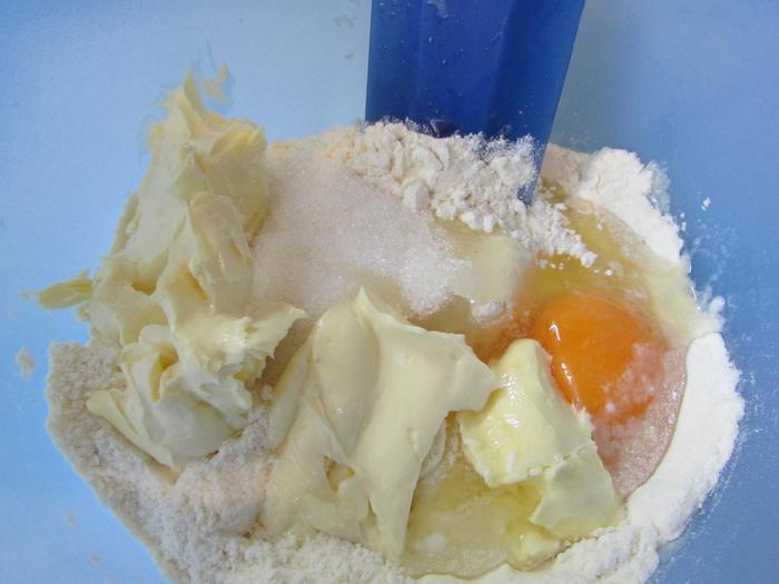 В миске смешать муку, разрыхлитель, сахар, сливочное масло (у автора натереть масло на крупной тёрке), яйцо.