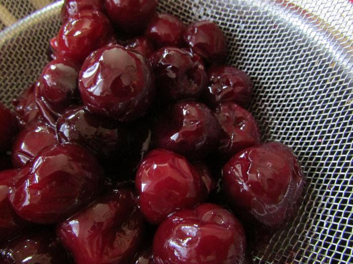 Затем откинуть на сито и дать стечь сладкому сиропу (этим сиропом хорошо пропитывать бисквит). Начинка готова.