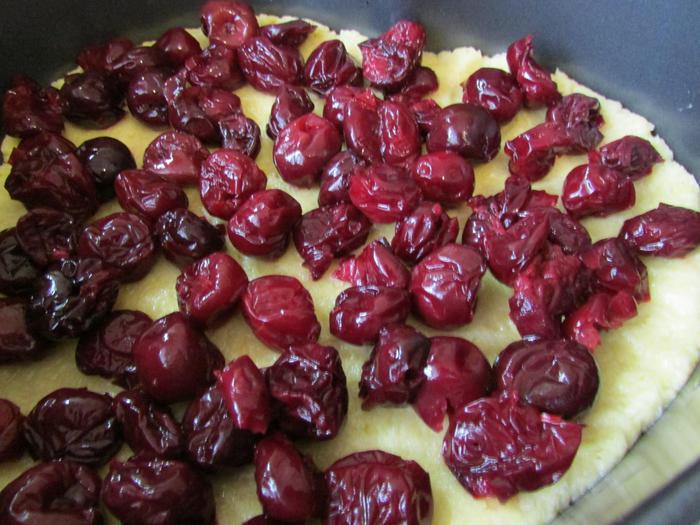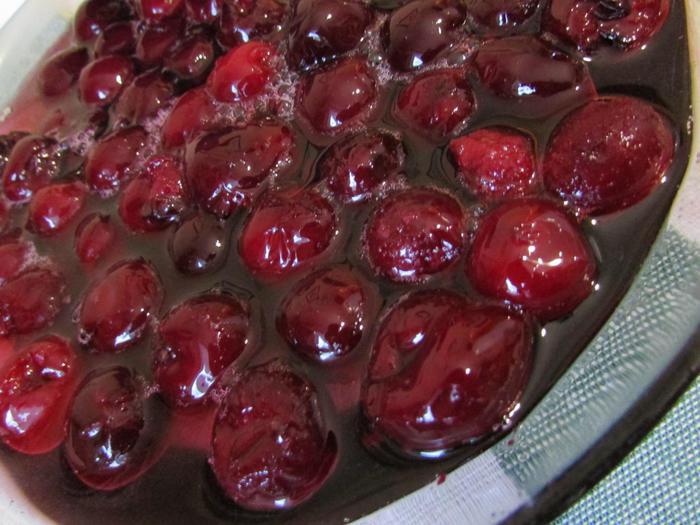 Подготовить начинку. В сотейнике смешать воду и сахар. Поставить на огонь и довести до кипения. Залить вишню горячим сиропом (так вишня получается целой и красивой). Оставить на 10 минут.