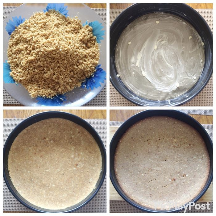 Полученную смесь для основы выкладываем в подготовленную форму, плотно утрамбовываем. Можно корж вообще не выпекать, а просто отправить в холодильник, чтобы корж застыл, тогда торт будет полностью без выпечки.