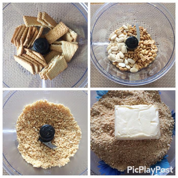 Перетереть печенье и орехи с маслом.