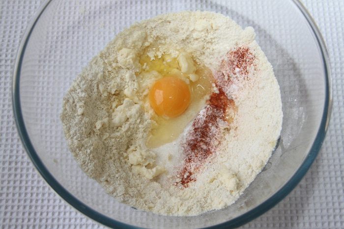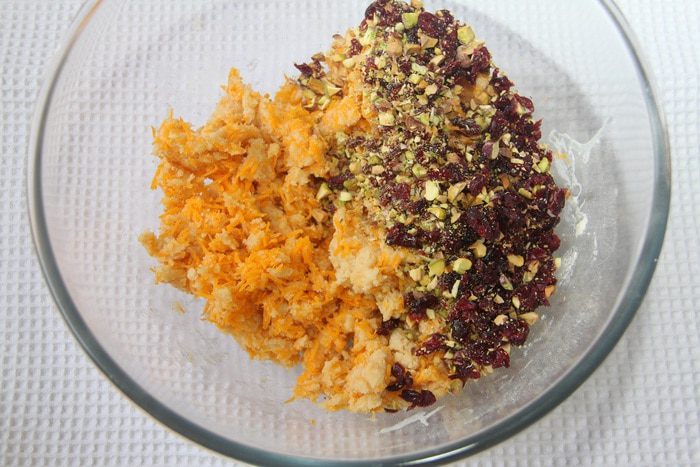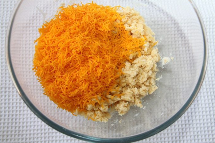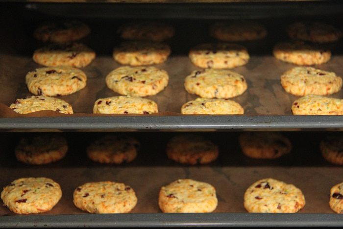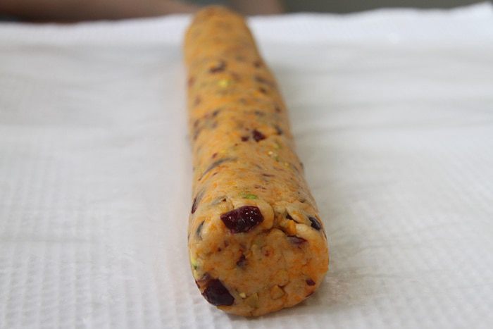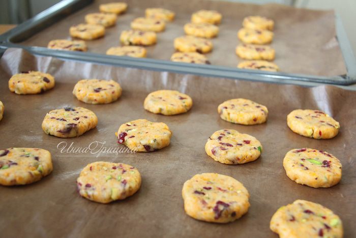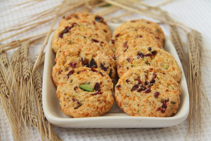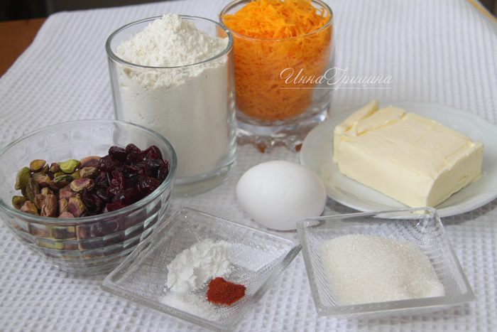 Итак, нам понадобятся: 1 стакан муки (180 г), 1 стакан сыра чеддер (110 г), 1 яйцо, 110 г сливочного масла, 2 ст.л. сахара (30 г), 1 ч.л. разрыхлителя, 1/2 ч.л. соли, 1/4 ч.л. кайенского молотого перца, 1/2 стакана фисташек, 1/3 стакана вяленой клюквы.