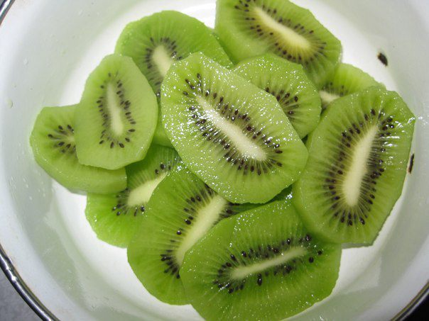 Моем, чистим и нарезаем киви. Кусочками или дольками.