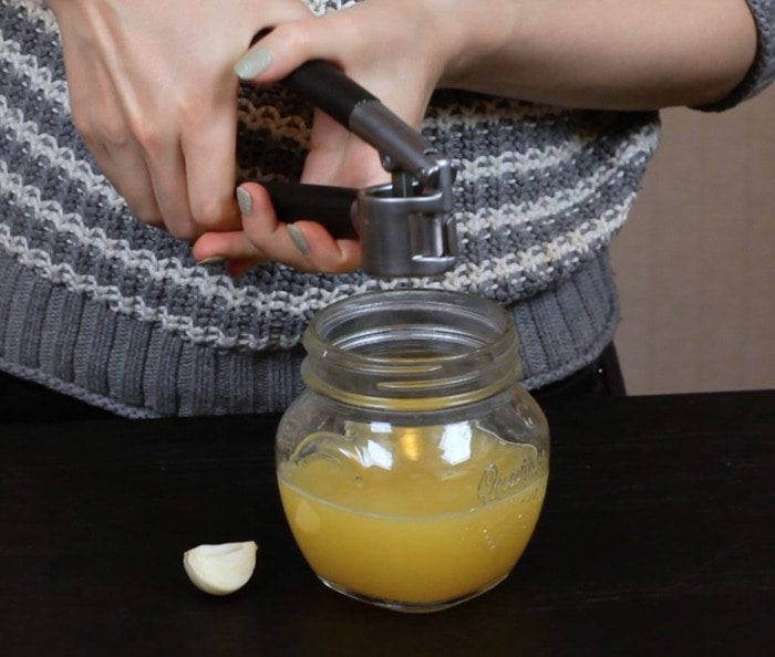 Соединить апельсиновый, лимонный и лаймовый соки, добавить измельчённый чеснок и перемешать.