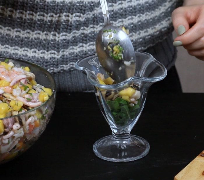Остаётся только сервировка. Сначала кладём слой руколы, затем слой севиче. Повторяем, пока не заполним полностью креманки.