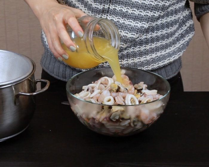 Переложить морепродукты в миску, залить соком с чесноком и оставить на 5-6 часов мариноваться.