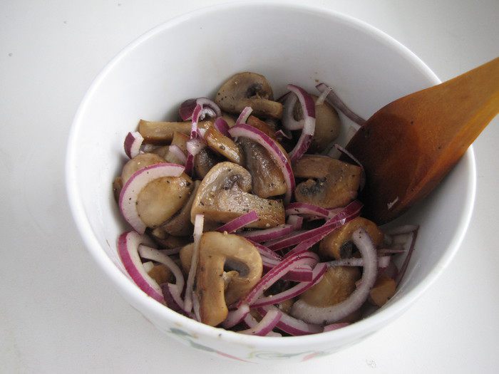Готовые шампиньоны выложить в миску, посолить, поперчить, добавить мелко нарезанный зубчик чеснока и красный лук, нарезанный тонкими полукольцами. Добавить несколько капель уксусной эссенции. Все хорошо перемешать и оставить остывать.