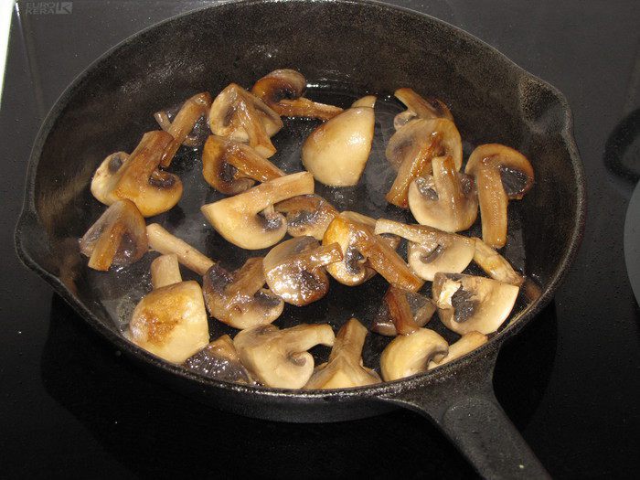Пока мясо запекается, приготовим грибы. Разрезать крупные шампиньоны на 4 части, мелкие пополам или оставить целиком. Разогреть в сковороде растительное масло и обжарить шампиньоны до готовности, постоянно помешивая, чтобы получить золотистый цвет.