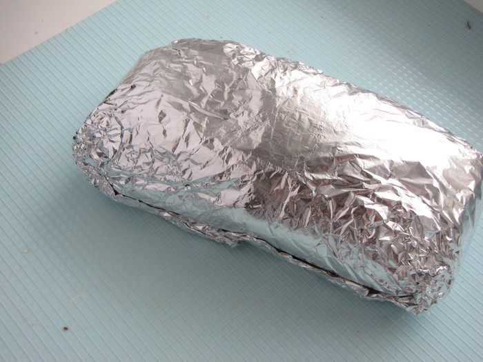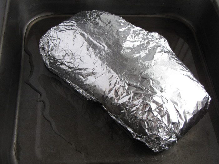 Плотно обернуть мясо фольгой, как бы придавая округлую, ровную форму. Можно обернуть еще одним куском фольги для надежности, чтобы не вытек сок. В таком виде оставить мясо мариноваться некоторое время или можно запечь сразу.