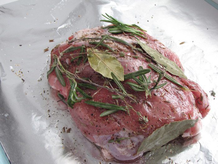 Сверху кусок обложить лавровым листом и свежими травами. У меня не было свежего тимьяна, заменила сухими веточками, которые засушила сама.