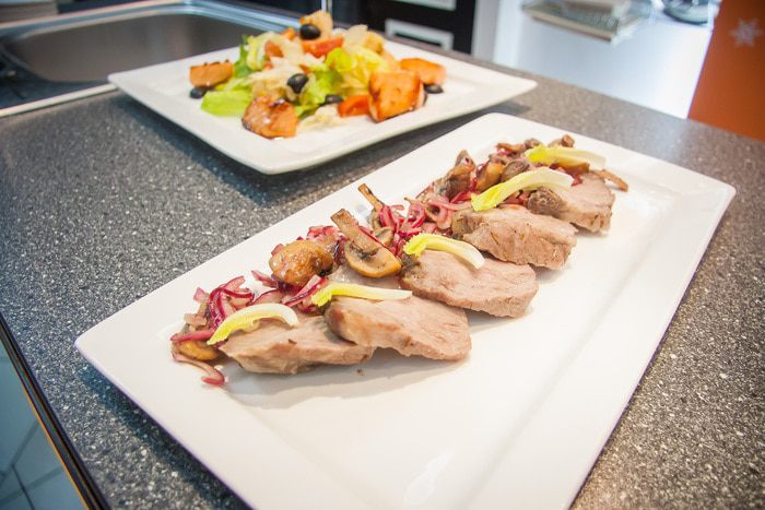 Подавать буженину будем с легким гарниром из шампиньонов и красного лука, который мы приготовим заранее.