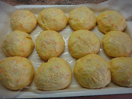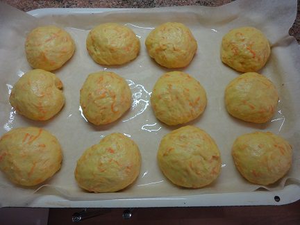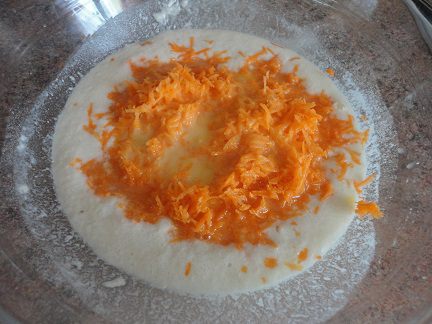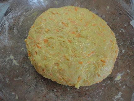 Добавляем мелко натертую морковь, ванилин, соль, растопленное сливочное масло и оставшийся сахар. Размешиваем, чтобы сахар растворился. Теперь можно просеивать сюда муку и замешивать тесто. Можно было и 500 г, возможно, вам столько и понадобится, все зависит от сочности моркови. Но я оставила довольно мягкое, даже липкое тесто.