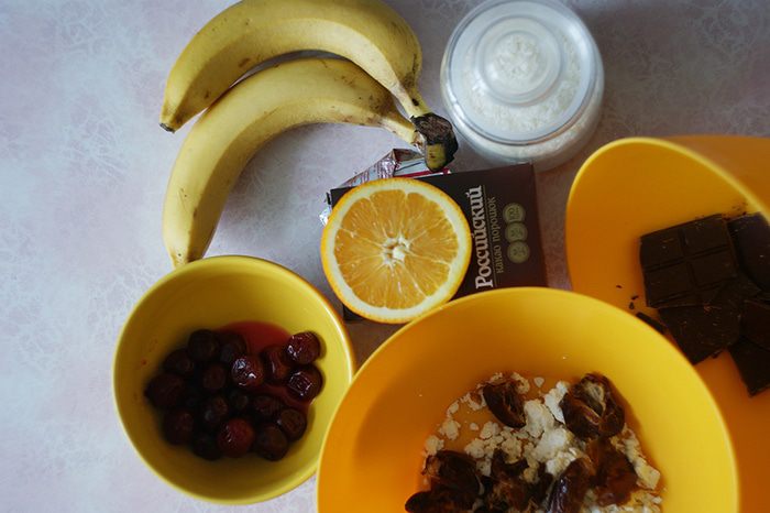 Творог и финики выложить в миску, добавить банан и все превратить в единую массу. Теперь трем сюда апельсиновую цедру и выдавливаем немного сока.