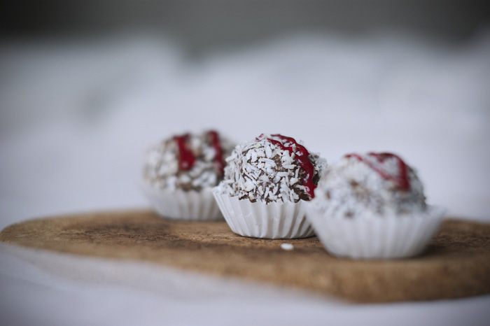 Так как я массу поделила, то внутрь шоколадных конфет я пихала вишню и катала шарик, а внутрь второй части — орех. А можно и тоже вишню.