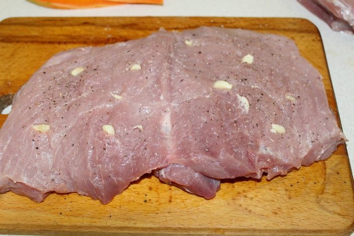 Мясо разрезать как книгу, нашпиговать чесноком. Натереть мясо солью, кориандром и черным перцем.