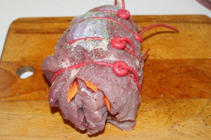 Очень туго свернуть мясо рулетом, крепко обмотать толстыми нитками или специальными жгутиками, сверху натереть солью и оставшимися травами.