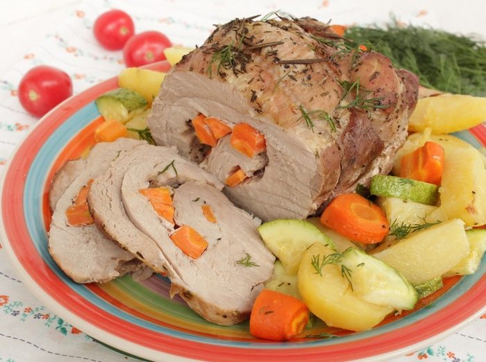 Затем мясо поставить в холодную духовку, выставить температуру 180-190°С и запекать около 1,5-2 часов. Подавать в горячем или холодном виде.
