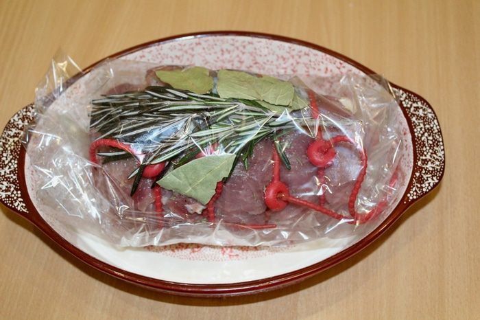 Вложить в рукав для запекания, сверху положить веточку розмарина и лавровый лист. Положить мясо в форму в пакете и убрать на ночь в холодильник.