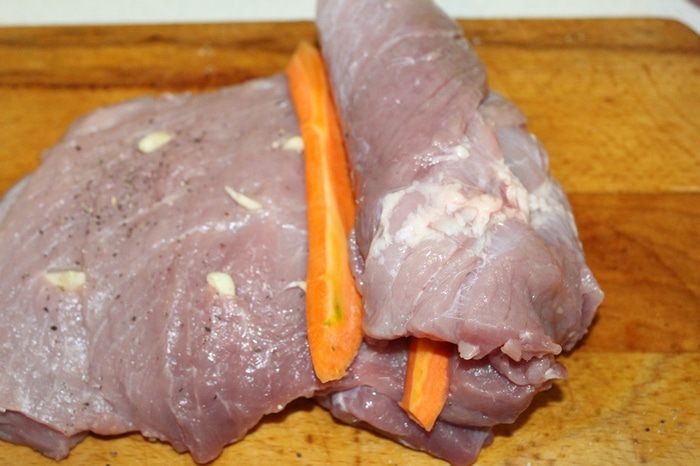 Закрутить мясо рулетом, вставляя полоски моркови. Посыпать немного мясо розмарином и тимьяном.