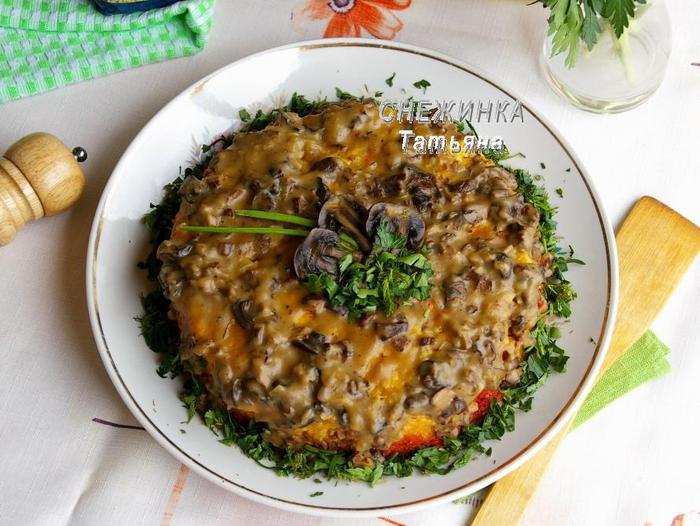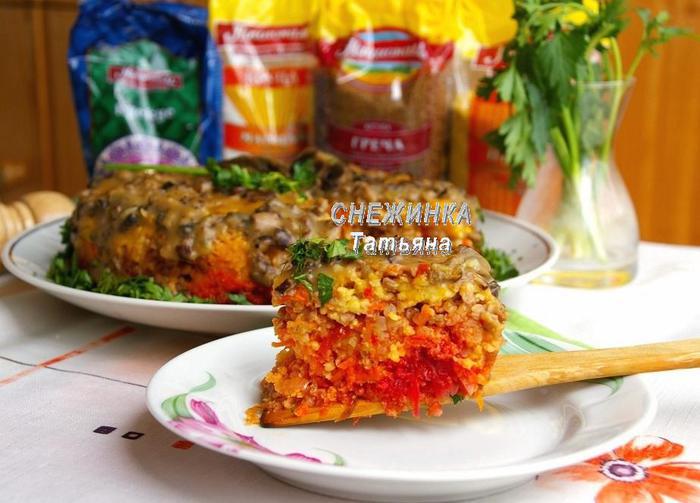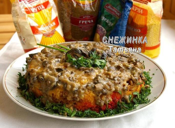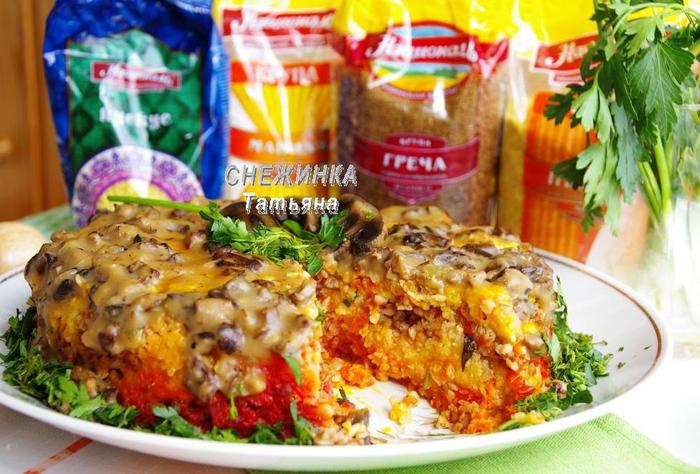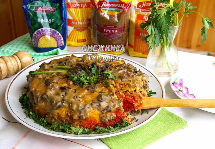 Из доступных продуктов — по-настоящему царское блюдо. Идея в том, что слой крупы чередуется со слоем овощей. Слои пропитываются друг другом, в результате пирог получается очень сочным и ароматным! Все ингредиенты очень полезны и питательны. Грибной соус создает завершающий аккорд. В пост можно приготовить такой слоеный пирог на праздничный стол, уверена, вы удивите близких или гостей. Да и не в пост, поверьте, вам будет очень вкусно!