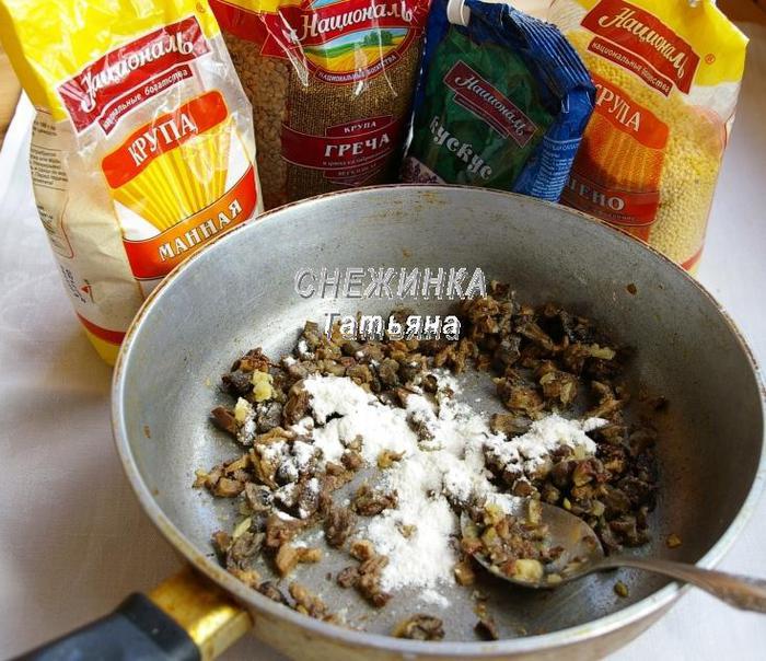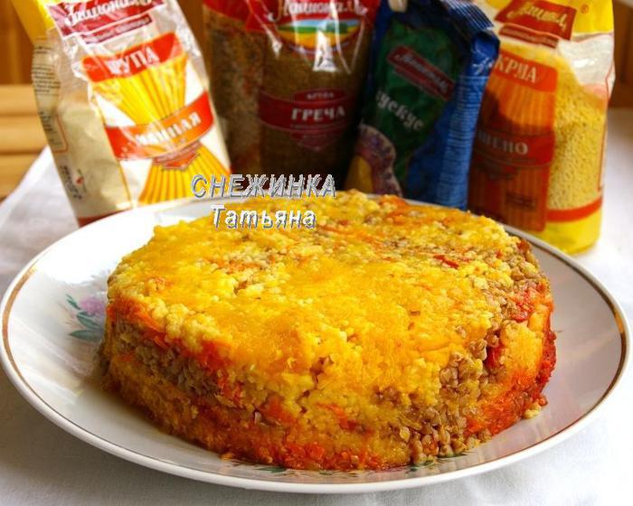 Важно: кастрюля для приготовления должна быть металлической, чтобы пирог не горел, с возможностью постановки ее в духовку. При этом кастрюля должна быть вместительной, когда вы положите все продукты, должно остаться много места в высоту для набухания крупы. В готовом виде пирог прекрасно режется на порции!