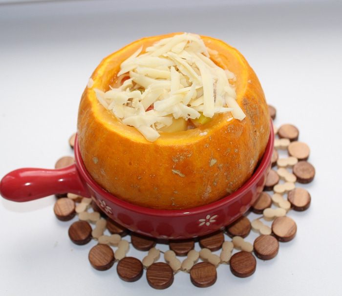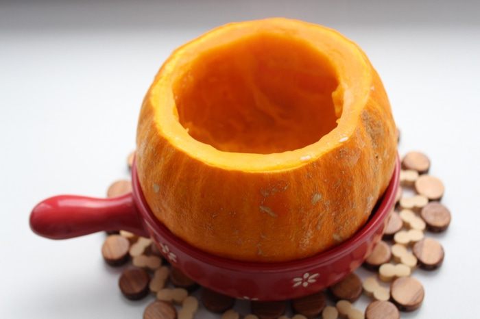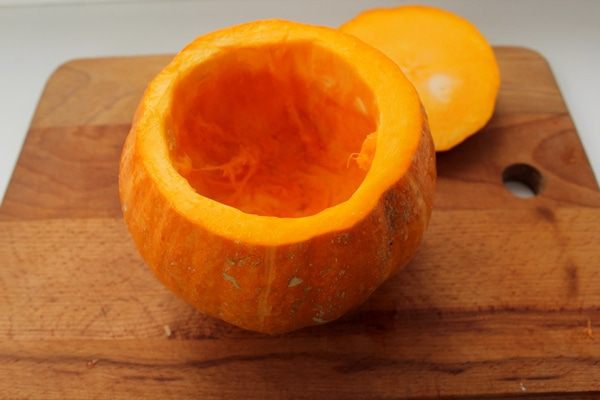 Вынуть мякоть и косточки из тыквы, аккуратно, чтобы не повредить.