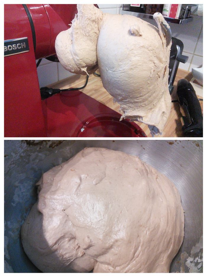 Тесто до и после подхода. Довольно плотное матовое тесто после расстойки становится более эластичным и блестит.