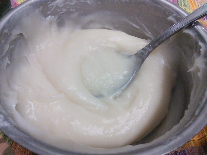Для стартера пшеничную муку смешать с солью и водой (воду добавлять постепенно, размешивая, чтобы не было комочков). На среднем огне при постоянном помешивании довести смесь до кипения. Когда смесь заварится, снять с огня.