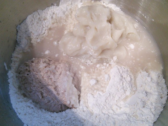 Для опары смешать муку с солью и разведёнными в тёплой воде дрожжами в плотное тесто. Накрыть ёмкость плёнкой, дать отдохнуть при комнатной температуре (в тёплой кухне при 20°С) около 2 часов, затем поставить в холодильник на 24-36 часов.